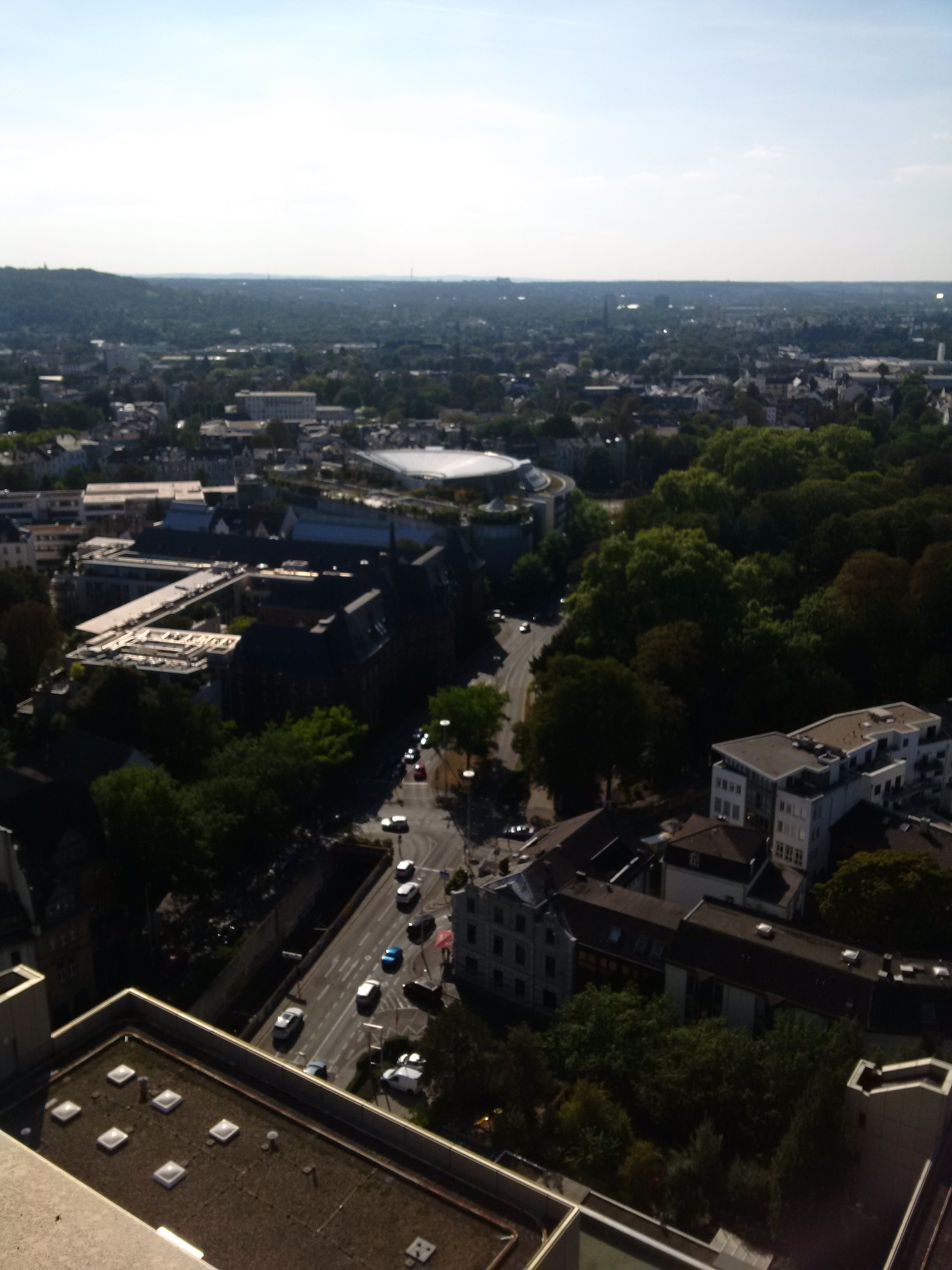 In Bonn angekommen, wurden im Hotel Domicil zunächst über eine spektakuläre Rampenanfahrt die Autos unter dem Hotel geparkt und dann die Zimmer bezogen. Alles war ordentlich und sauber, allein die Raumgrößen waren mitunter kaum noch zu unterschreiten. Am frühen Nachmittag erwartete unsere Touristengruppe eine Stadtführerin zur „Dächerwanderung“. Dazu ging es auf das Dach des Bonner Stadthauses, welches einen herrlichen Rundblick in die Rheinische Ebene Richtung Köln einerseits und in das engere Rheintal im Siebengebirge andererseits ermöglichte. Besonders der ausgefallene Architekturmix aus ultramodernen Gebäuden und historischer Bebauung ist erwähnenswert und interessierte uns besonders. Immer wieder erinnerten sich einige von uns auch an die großen Demos aus den 1980er Jahren. Hier in Bonn ließ sich manche Rückschau auch an den damaligen Bonner Hofgarten wieder beleben.